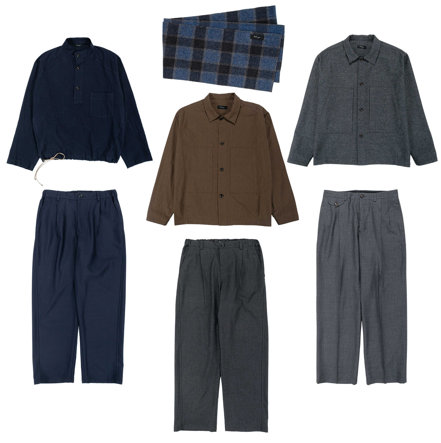 For this exclusive, we wanted to revisit some of our best-selling styles and reinterpret them in new materials. Many of the pieces draw references from Japanese and European workwear traditions. The fabrics are sourced from Japan and Italy, ranging from dyed raw cotton silk, yarn-dyed cotton, and cotton wool herringbone to washed cotton linen and super 120s worsted wool.” — Wanze Song