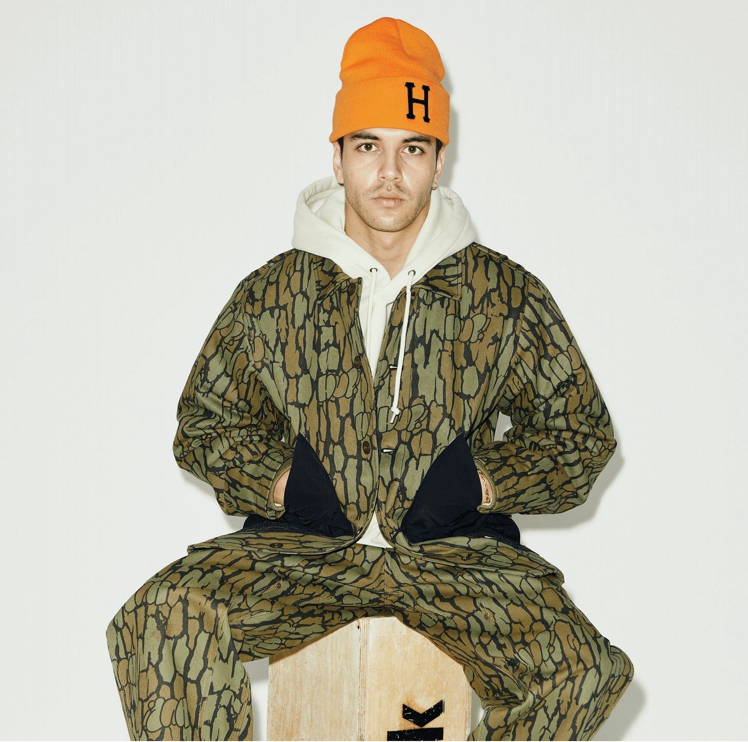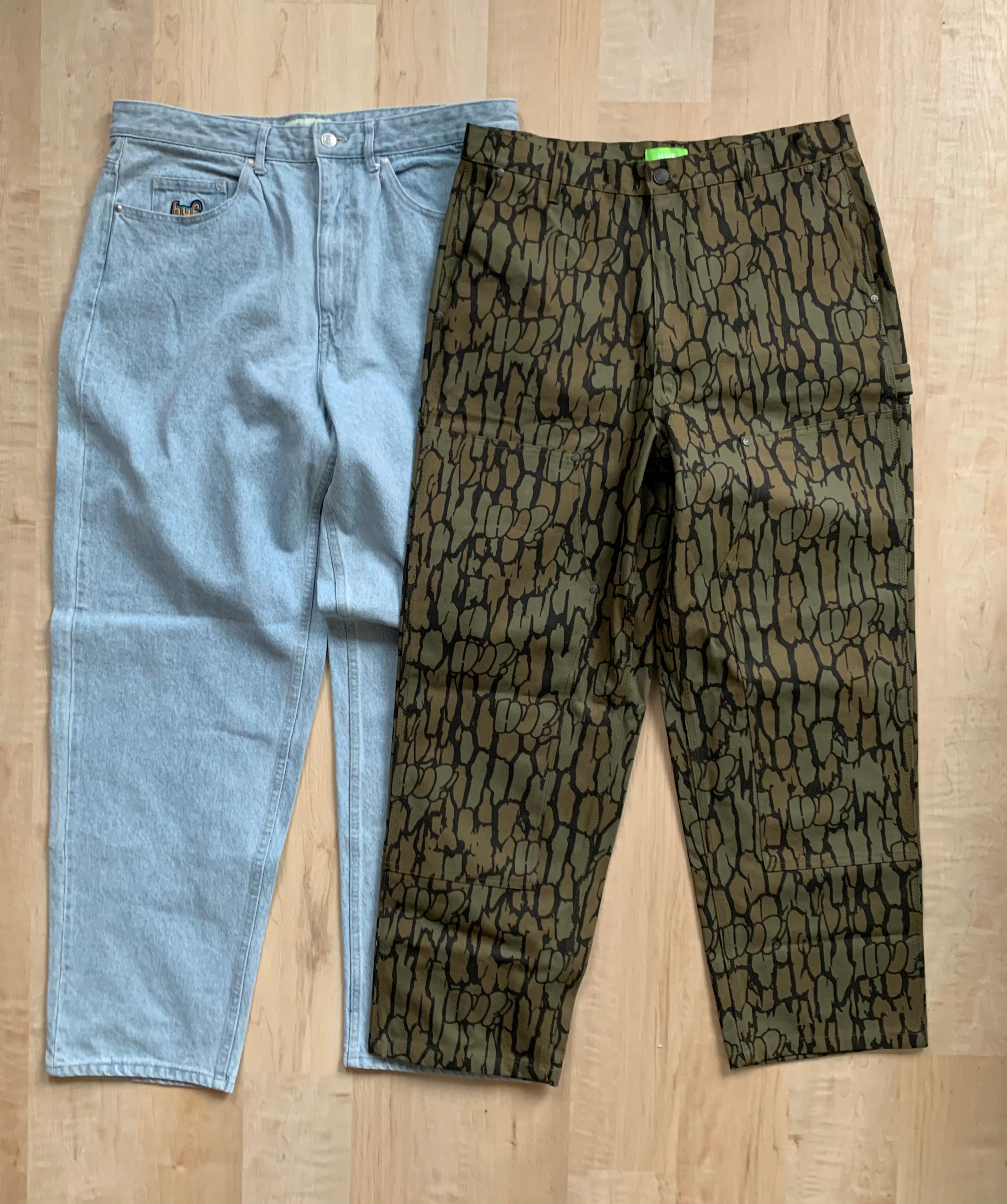 I’m excited to wear these a whole lot more to give them the proper testing they deserve—Actually excited to skate the denim because a lot of my baggy pants end up rubbing on the grip tape because of the excess material stacked at the bottom of the pant, so I’m hoping that these might be perfect for that. We obviously need to highlight the Bark Camo pants, which are part of the set I mentioned above earlier. The pattern on these is a lot of fun, and the hidden HUF logo within the camo is a fun little detail that doesn’t stand out that easily—you have to look for it! These are definitely more on the stiffer side due to the duck canvas used, but once you wear them a bunch they will break in really nicely.