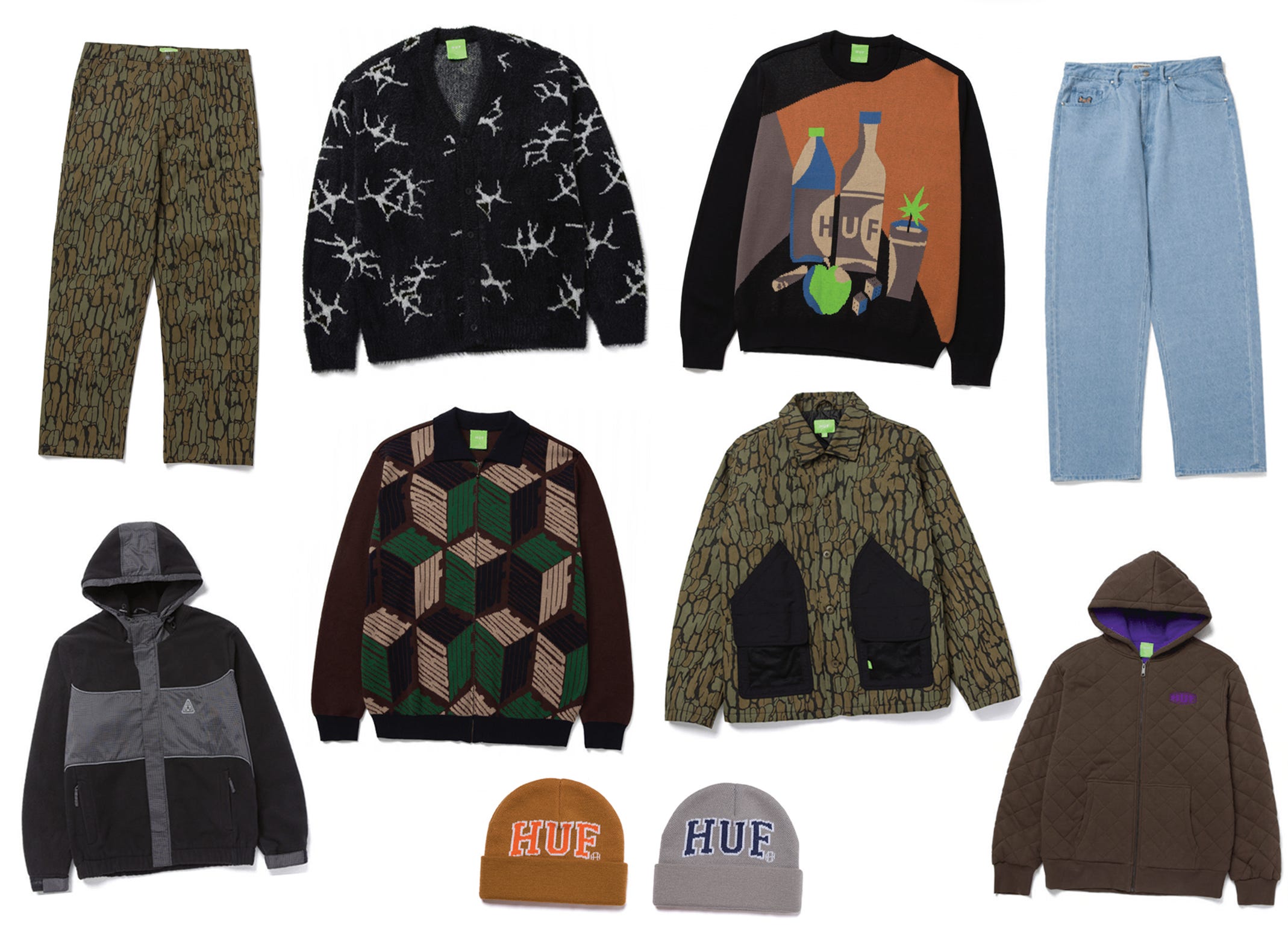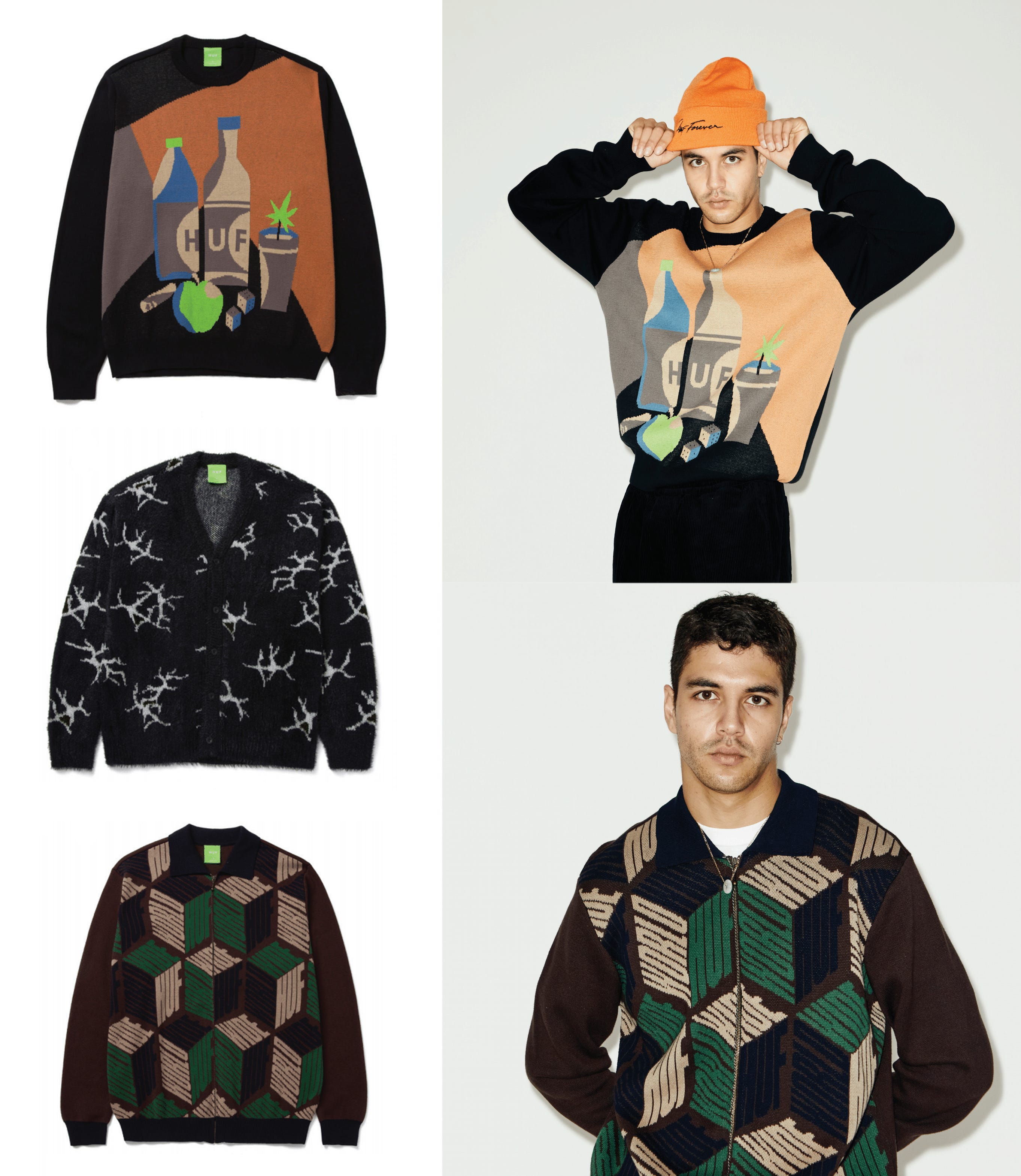 HUF’s knit game is very solid. Some good cardigans—haha, you know me, I forget how to act when a brand makes all patterned cardigans, so excuse me in advance —great zip-ups and a really fun sweater I might have to buy myself later today.