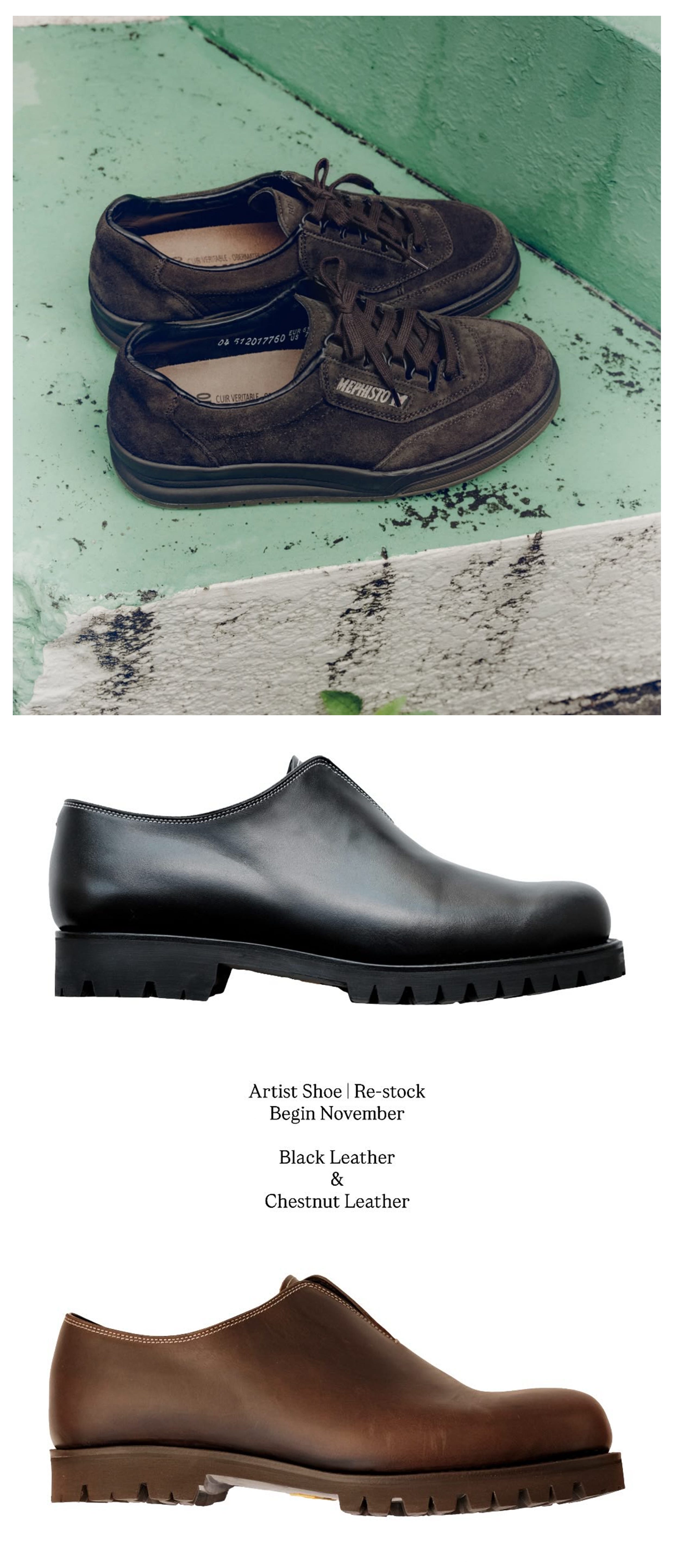 The second restock that’s coming sometime in November is the Artist Shoe by An Irrational Element. A laceless slip-on handmade in Spain in calf leather sitting on some Vibram soles. I mean, it doesn’t get much chicer than that.