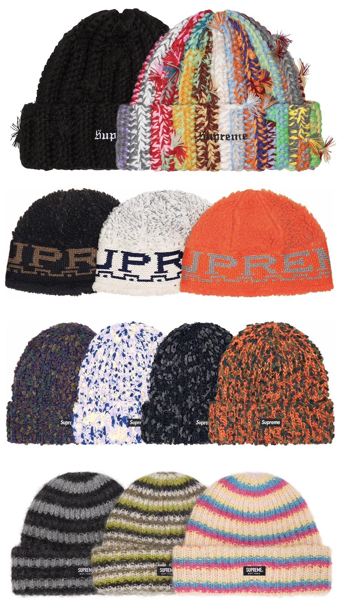 Beanie season is approaching, which means that it’s time to start collecting that dome-protection research. While Supreme is known to recycle a few common beanie styles, there are always a few unique options that definitely grab my attention. Here are some of my favorites — I clearly have a specific type of beanie right now…
